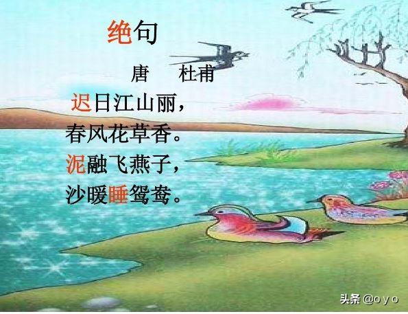【答案】:描写了一幅明丽和谐、柔和温暖的春景图。【原文】:绝句朝代:唐代作者:杜甫迟日江山丽,春风花草香。泥融飞燕子,沙暖睡鸳鸯。【译文】:江山沐浴着春光,多么秀丽,春风送来花草的芳香。燕子衔着湿泥忙筑巢,暖和的沙子上睡着成双成对的鸳鸯。【注释】: