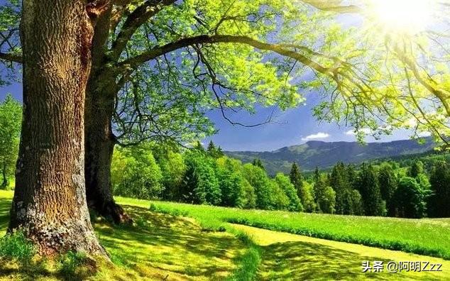 12、白杨树舒展着碧绿的叶子,吮吸着春天的雨露。