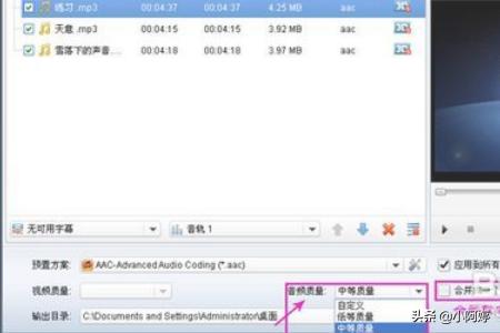 3、在软件主界面可以看到,打开音频质量的下拉菜单可以选择音频质量,在软件右下角“合并成一个文件”处,还可以选择合并任意歌曲,通过软件上方的“视频编辑”按钮,还可以随意截取mp3片段,总之功能多多!