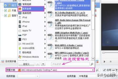 2、选择需要转换成的音频格式,打开预置按钮上拉菜单,在“常用音频”选项,选择一种需要的音频格式。软件可以支持转换aac、ac3、aiff、amr、 m4a、mp2、mp3、ogg、ra、au、wav、wma、mka、flac(无损)、wav(无损)等音频格式。