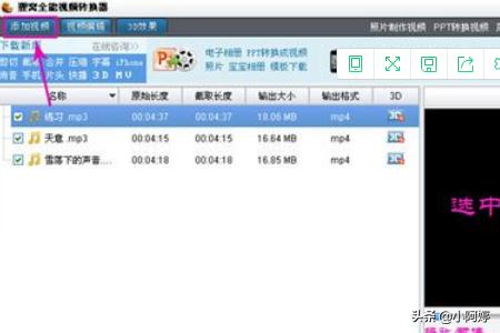 狸 窝格式转换器1、首先第一步是运行软件把文件导入软件,导入按钮都是“添加视频”按钮。导入之后,选中歌曲点击右边预览窗口的播放按钮,可以试听歌曲。