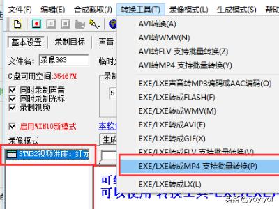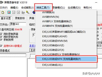 1、下载屏幕录像专家软件并打开,点击菜单上的转换工具——EXE/LXE转成MP4支持批量转换。