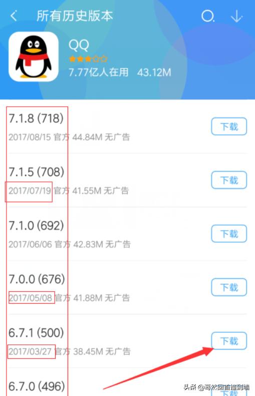 5、点击查看就可以根据版本序列号或者是更新的时间来下载低级版本,点击APP后方的下载命令就可以把低级版本下载到手机上使用了。