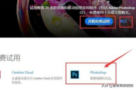 3、在下载和安装页面,选择点击免费试用中的Photoshop。