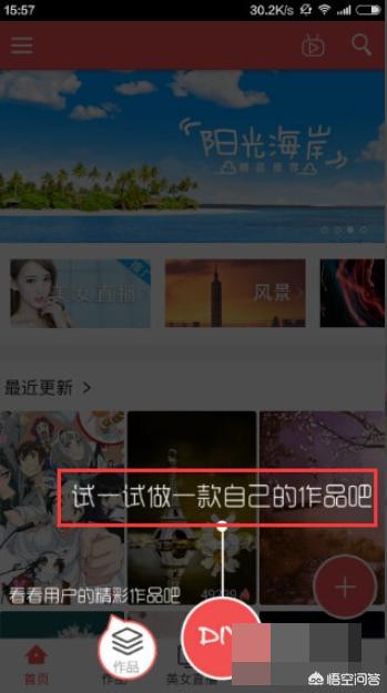 4、进入到主界面后,可以看到提示“试一试做一款自己的作品吧”,然后用手指点击一下右下角的“+”图标。