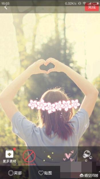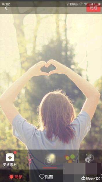 8、进入到编辑界面,在这里下方工具栏上有“局部”、“贴图”、“全屏”、“点击”、“文字”菜单,点击相应的按钮可以对背景图片进行相应的修饰。首先点击“局部”菜单,在里面有好多素材,可以选择适合背景图的素材,这里选择了光影素材。