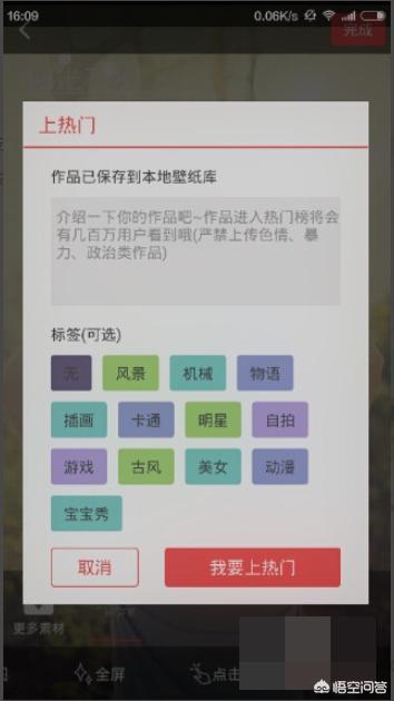 14、然后,会弹出一个“上热门”的窗口,也提示作品已保存到本地壁纸库中,此时你可以选择“取消”,也可以上传图片进热门榜。