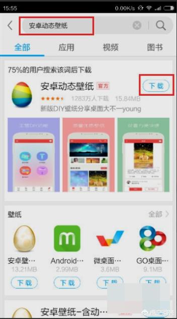 1、首先在应用包或360手机助手中,搜索“安卓动态壁纸”,在搜索结果中,点击“下载”按钮,下载这个制作动态壁纸的软件。