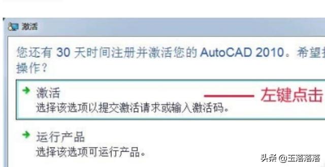 我们左键点击Auto CAD 2010运行程序,在打开的激活窗口,点击:激活;