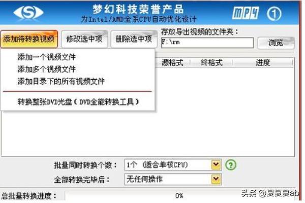MP4/RM转换专家除了支持将MP4转AVI,更是支持将MKV、MTS、TS、TP、RMVB、WMV、MP4等各种视频格式的转换。导入视频文件过程中,支持多种添加视频方式,添加一个视频文件,添加多个视频文件,添加目录下所有视频文件,模式多样,无论是多个文件还是单个文件,各种不同情况都能一键快速添加,细节处体现人性化。如下图,不仅如此,软件还支持转换整张DVD光盘,点击“转换整张DVD光盘”,通过这一工具,可以将我们市面上购买的DVD光盘选择字幕、音轨、角度,按标题、章节转换成AVI、3GP、MP4等视频格式,在手机等移动硬件上观赏 。
