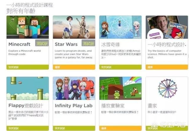 进入http://Code.org,注册一个帐号后就可以开始尝试里面的玩游戏学编程课程,可以看到首页上有许多花费一小时时间可以完成的课程,都是用知名游戏或电影的角色来组成的,比如《愤怒的小鸟》、《植物大战僵尸》、《星球大战》、《Minecraft我的世界》等。