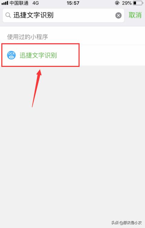 3、在打开的搜索框中搜索小程序:迅捷文字识别,然后搜索并点击打开。