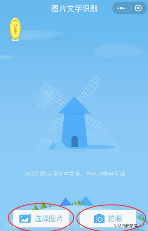 4、点击进入小程序,在小程序的主页面,【添加图片】和【拍照】是两种不同的识别方法,选择图片是在你的相册中任意一张图片进行文字识别。而拍照就是当场用手机对准含有文字的图片拍照从而进行识别。