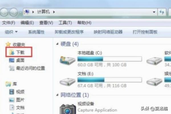 3、你也可以点击”开始“菜单里的”计算机“。左侧栏里也会有可能看到下载文件夹,如图所示。