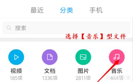 2、进入【文件管理器】后,在文件类型选择页面中选择【音乐】这一类型的文件,这样能更快的找到音乐文件。